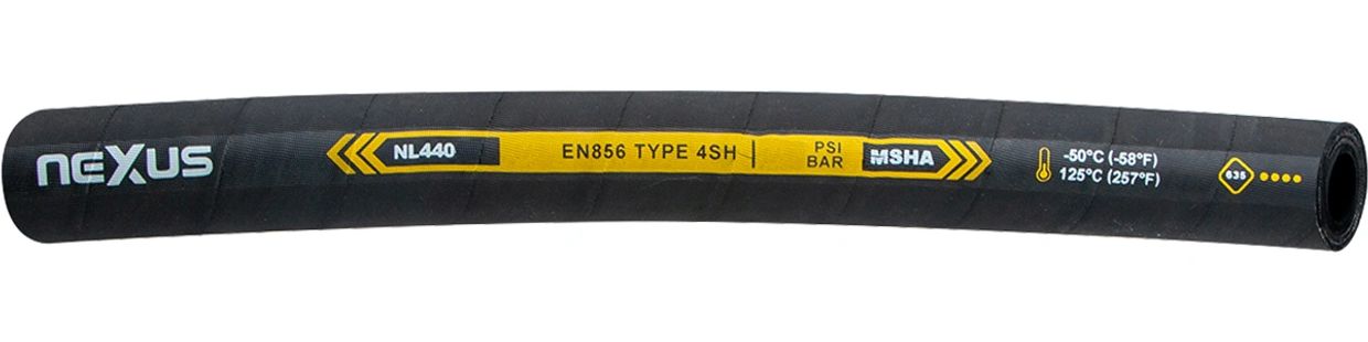 NL440 is a four spiral hose used in higher pressure industrial applications. This high pressure hose meets EN856 4SH and has a standard synthetic rubber tube and cover. This hose is designed with a MSHA flame resistant cover.